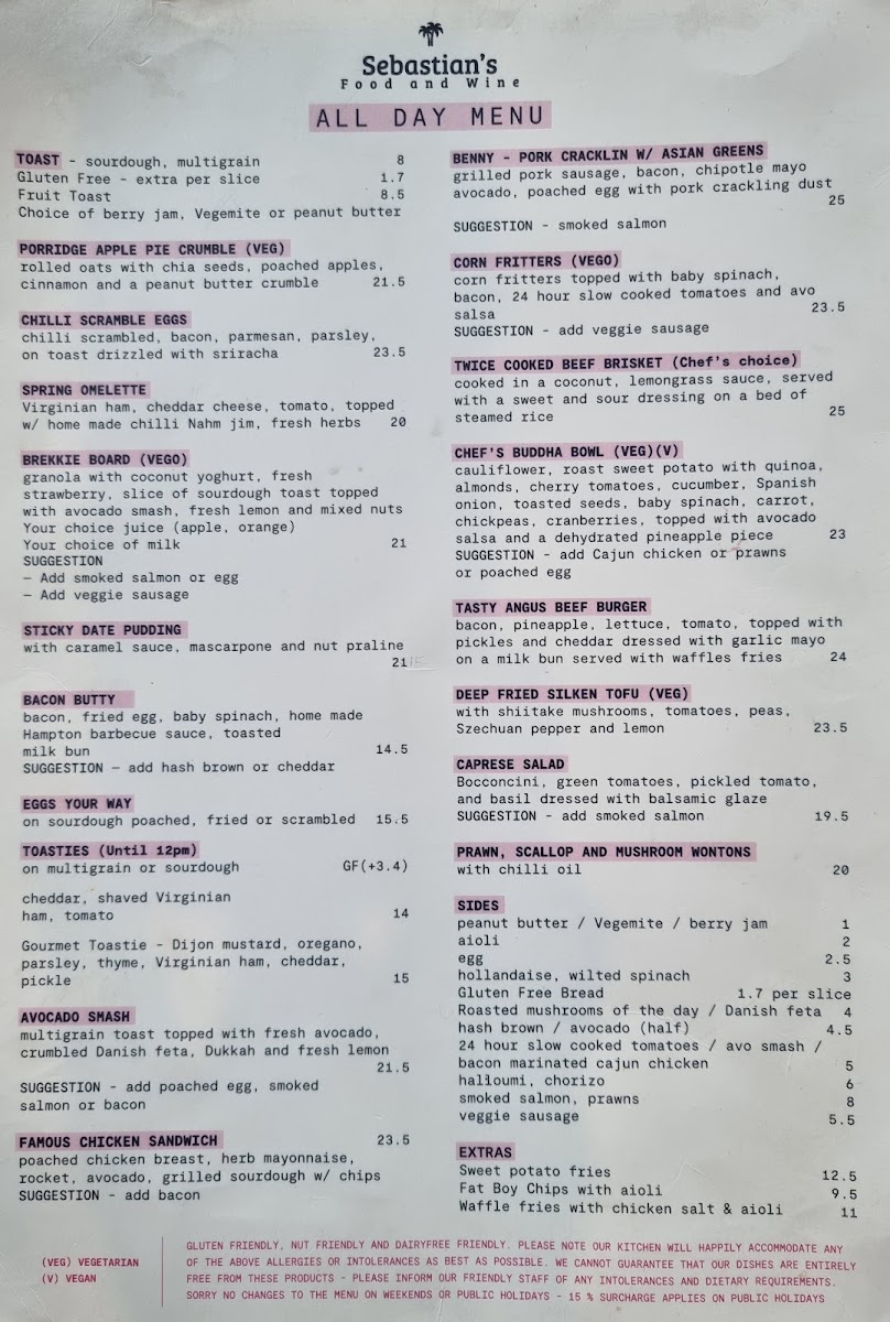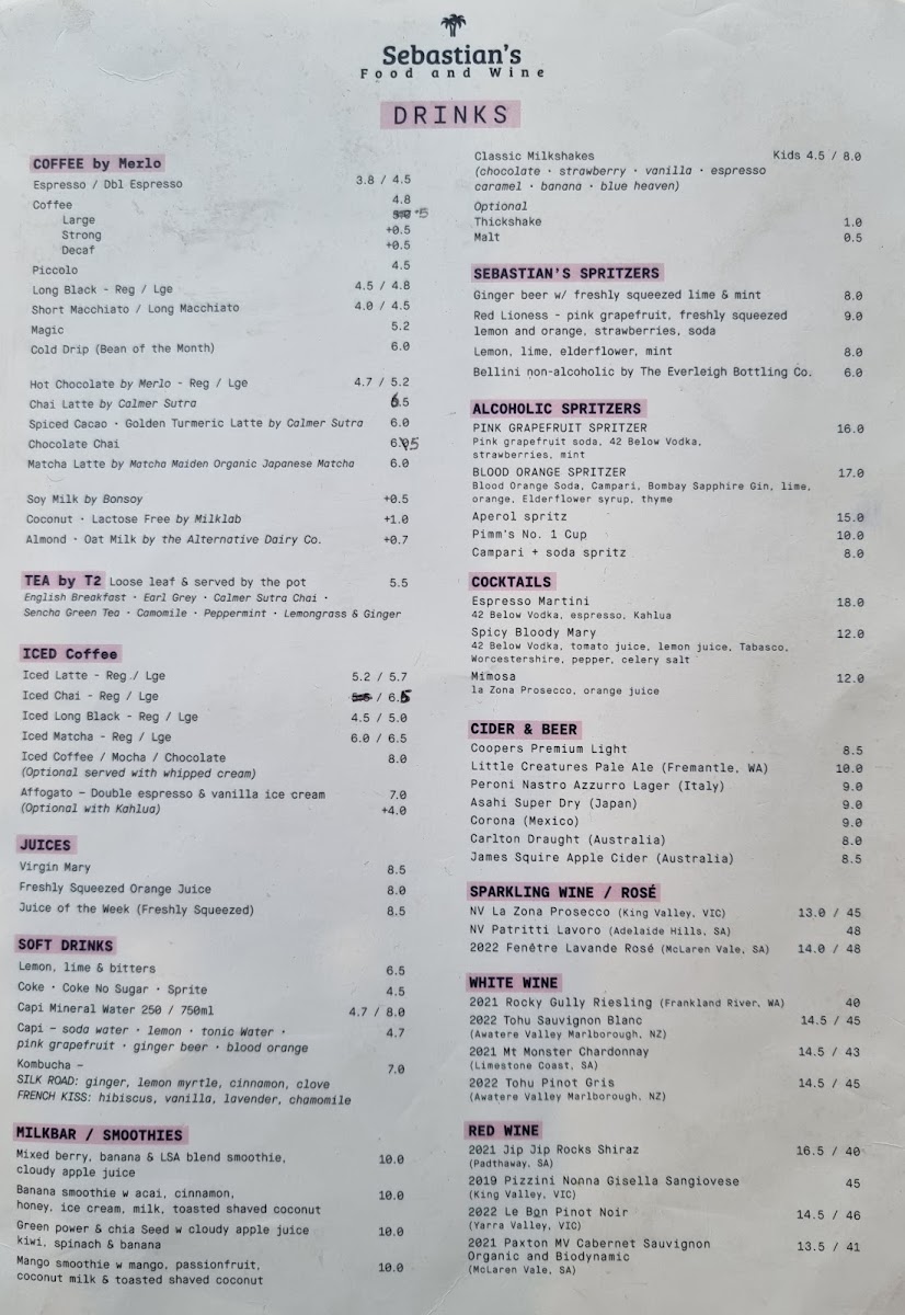 Sebastian's Food & Wine Menu